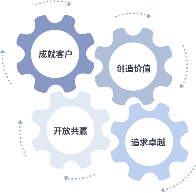 成就客户是一切决策的出发点,,创造价值是衡量所有工作的标准,,,追求卓越是我们做事做人的态度,,,开放共赢是我们的格局也是最终的结果。。价值观的齿轮环环相扣,,,推动着组织里的每个人不断向前。。。。